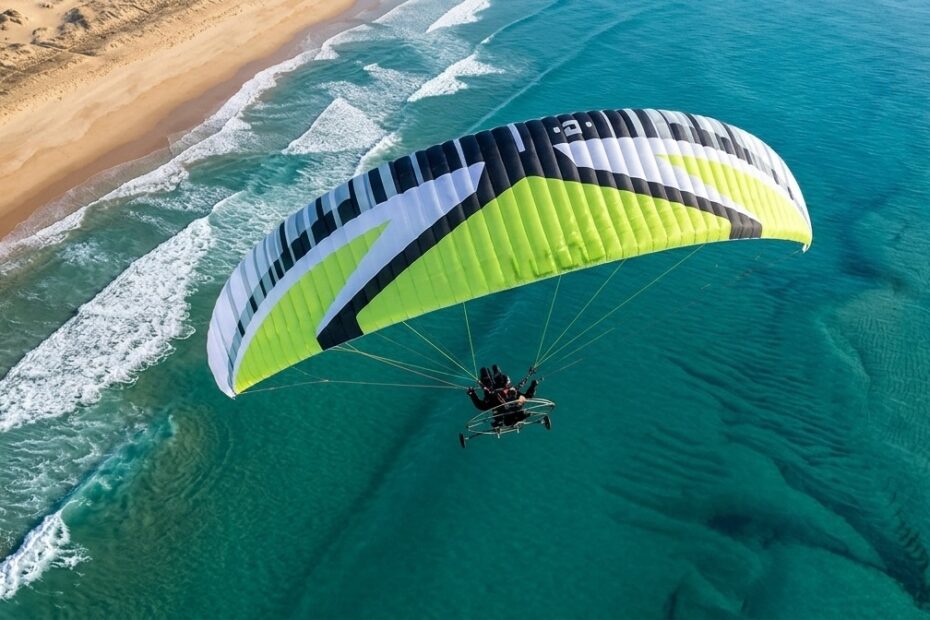 Installez-vous sur la sellette avant du biplace, casque sur les oreilles. Le moteur se met en route, l’hélice pousse le chariot sur quelques dizaines de mètres, puis la voile se gonfle et l’appareil décolle en douceur. La transition est progressive — pas de secousse, pas de sensation brutale. En quelques secondes, le sol s’éloigne et le panorama côtier apparaît.