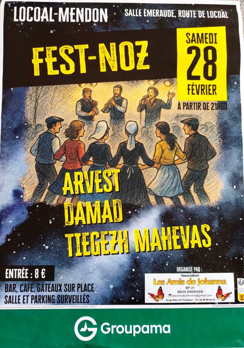 Le samedi 28 fevrier 2026 à partir de 21h, RDV pour un grand Fest-Noz à la salle Émeraude de Locoal-Mendon.