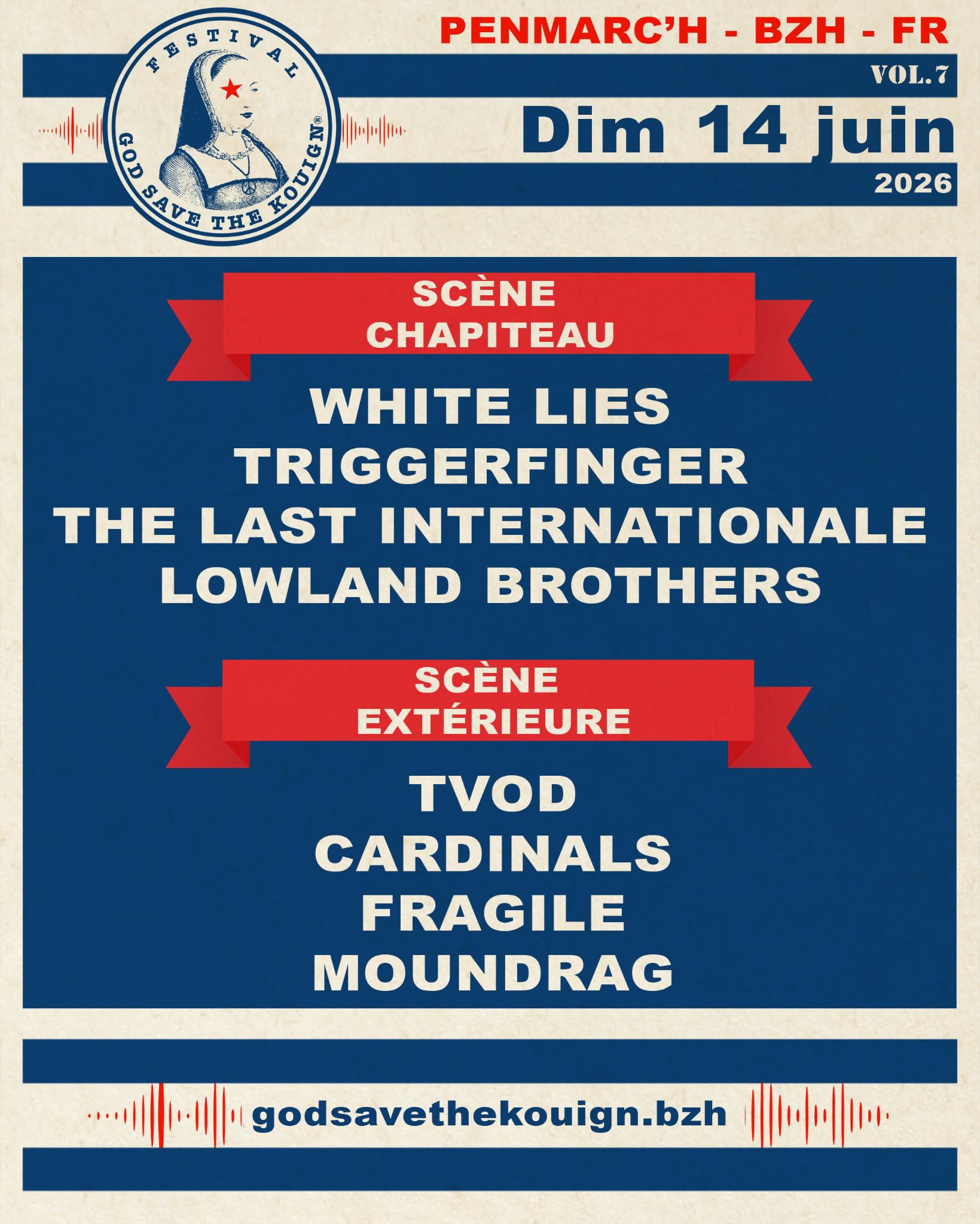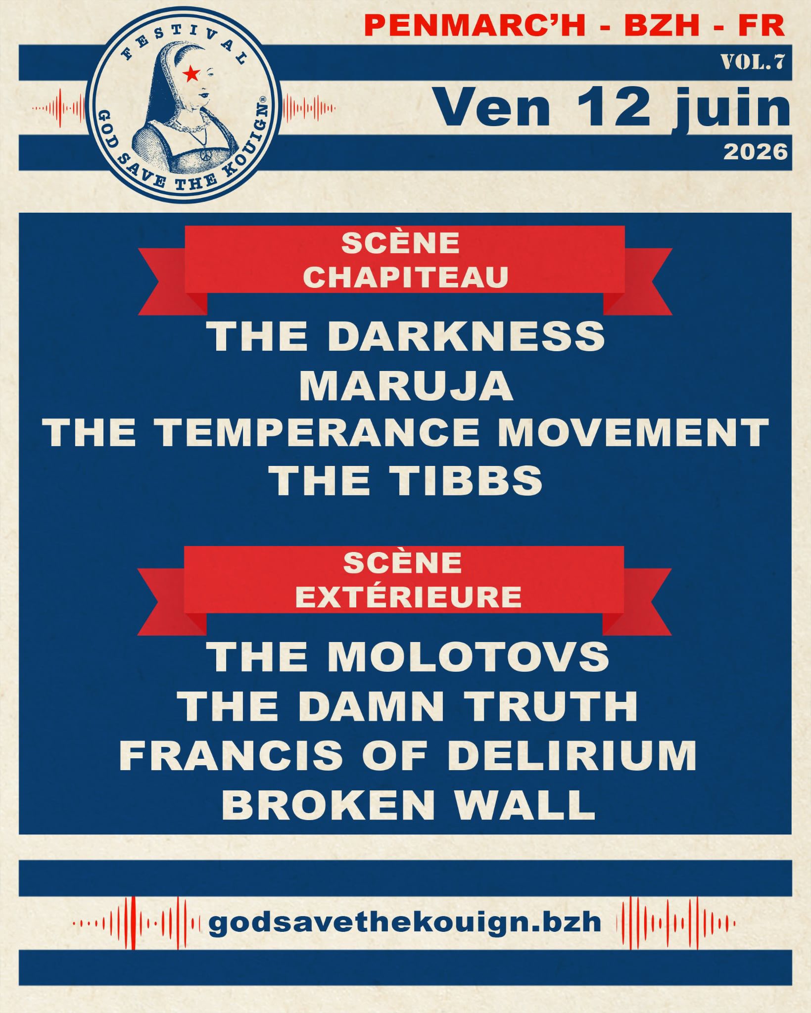 Le festival God Save The Kouign, édition 2026 (Volume 7), se tiendra les vendredi 12, samedi 13 et dimanche 14 juin 2026 au Stade Municipal de Penmarc’h (29).