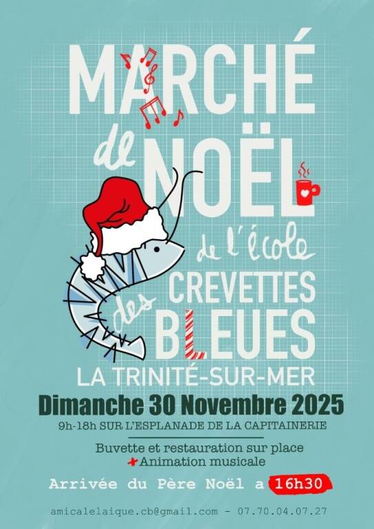 Marché de Noël de l’école des Crevettes bleues avec nombreux stands pour des idées cadeaux, animations musicales et arrivée du Père Noël à 16h30. - Le Croisty